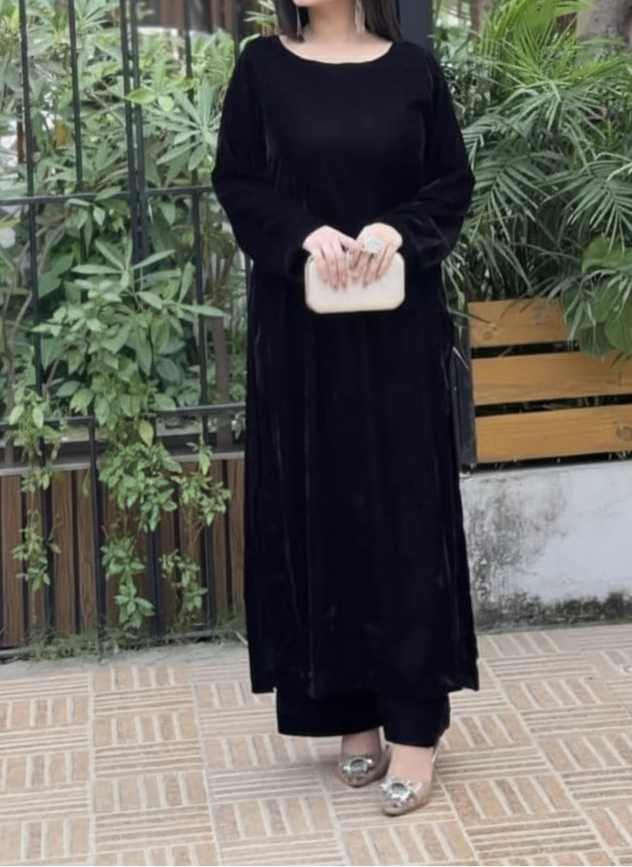 This classy 2-piece outfit is crafted from soft velvet fabric, offering comfort and elegance. Paired with silk trousers for a refined and stylish look.