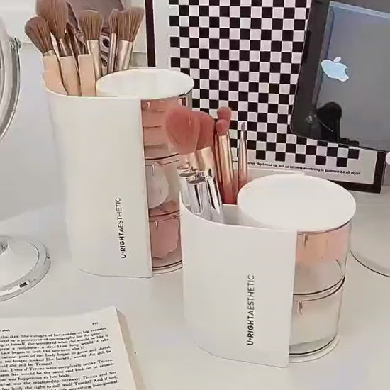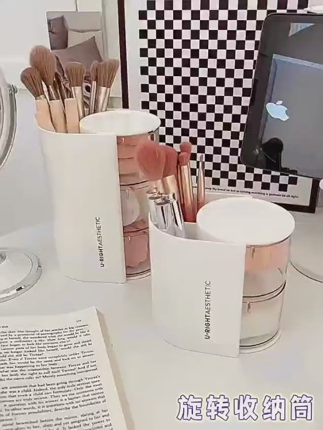 This 2-in-1 rotating cosmetic storage box is a sleek and multifunctional organizer designed to streamline your makeup storage.