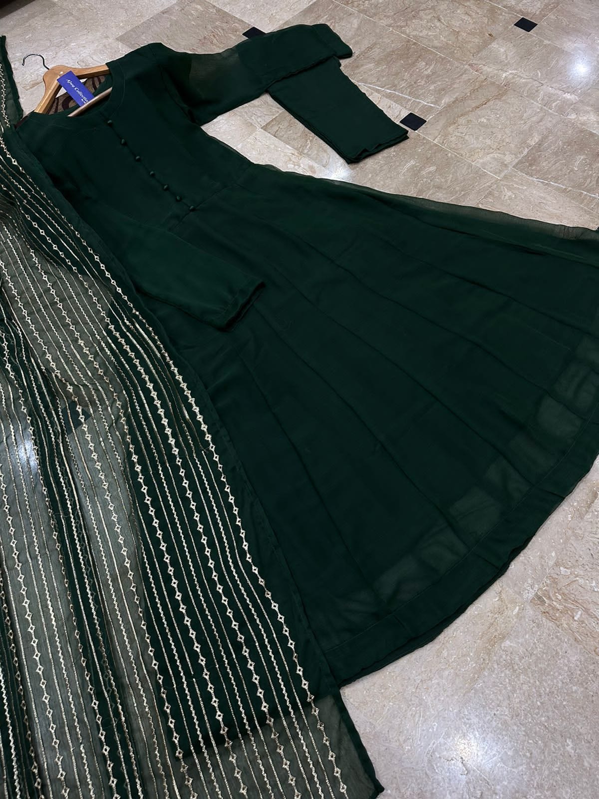 Allover Fully Embroidered Dupatta, With Handmade Button Kalli Work Long Flare Maxi 3Pcs