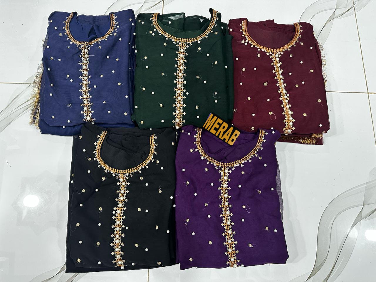 Neck ,Sleeves Embroidered Kaya work With Pearls Attached Long Maxi With Lace Work Chiffon Dupatta 3Pcs