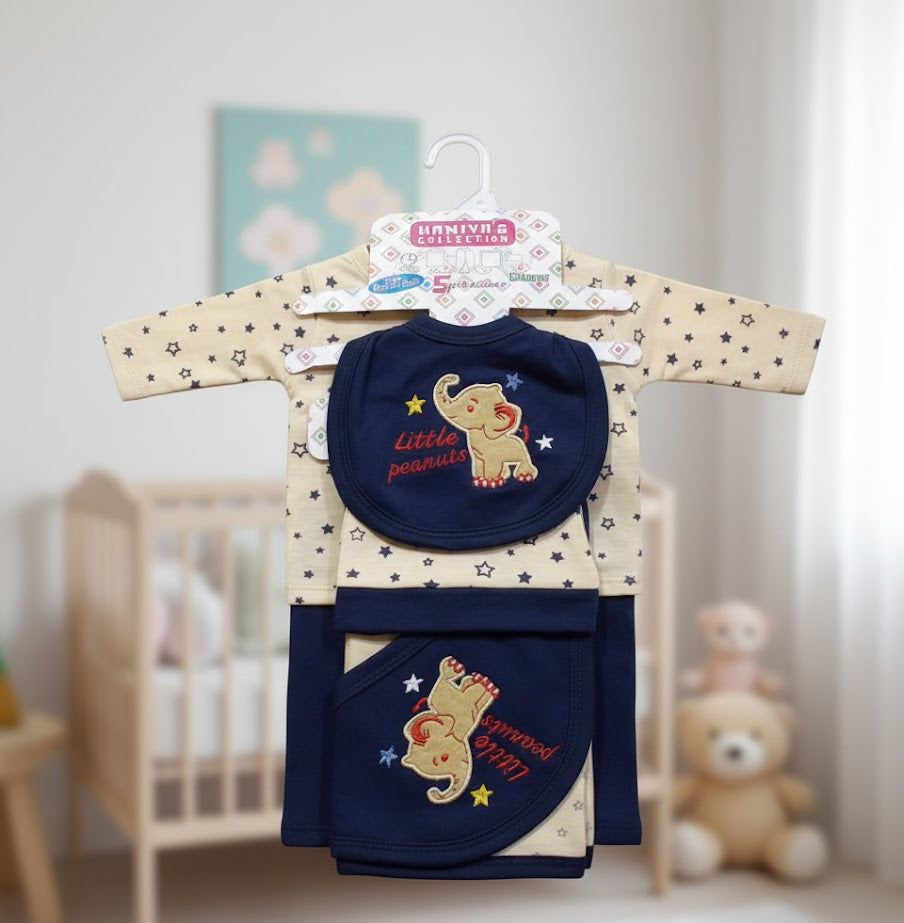 Welcome your little one in comfort and style with this adorable 5-piece newborn starter set. Crafted from soft, breathable jersey fabric, it’s gentle on delicate newborn skin and perfect for everyday wear.