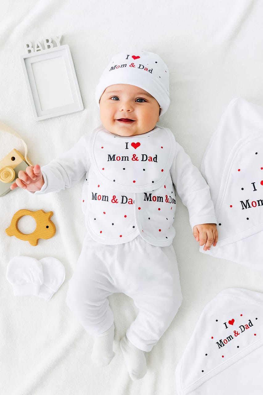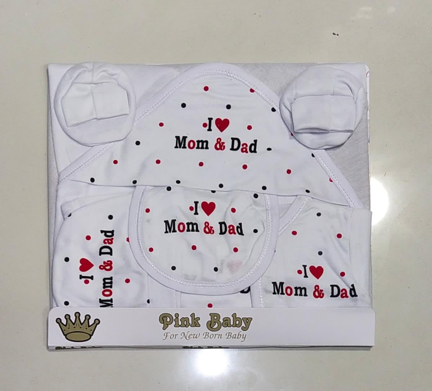 5pcs Starter Set - I ❤️ Mom & Dad •Fabric: Interlock •Size: 0 New Born •5pcs Include: 1xFront Open Printed Shirt 1xPyjama 1xPair of Booties 1xPrinted Cap 1xPrinted Bib 1xPrinted Hooded Wrapping Sheet