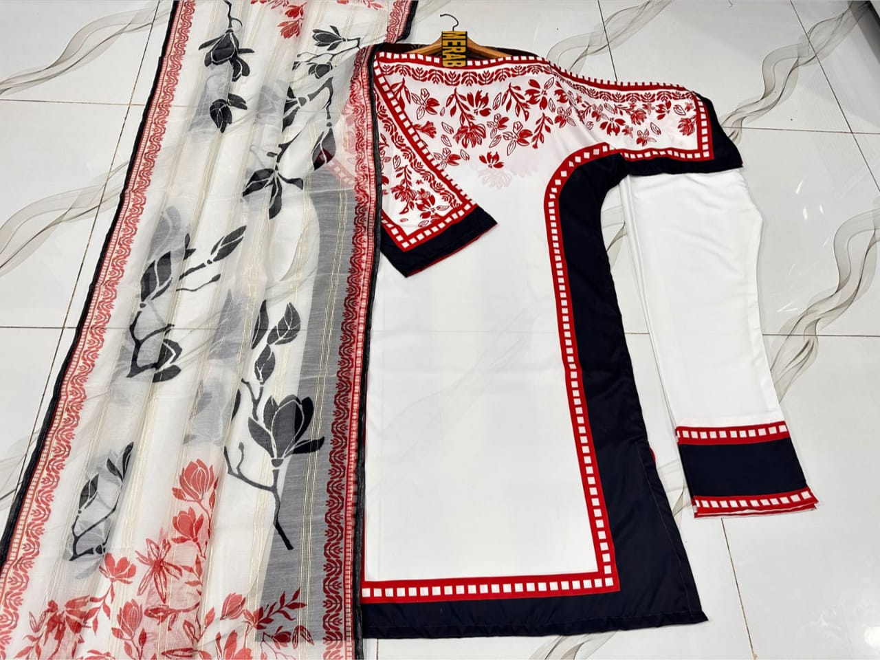 Front & Back Long Baggy Digital Printed Shirt With Printed Trouser Dupatta 3Piece