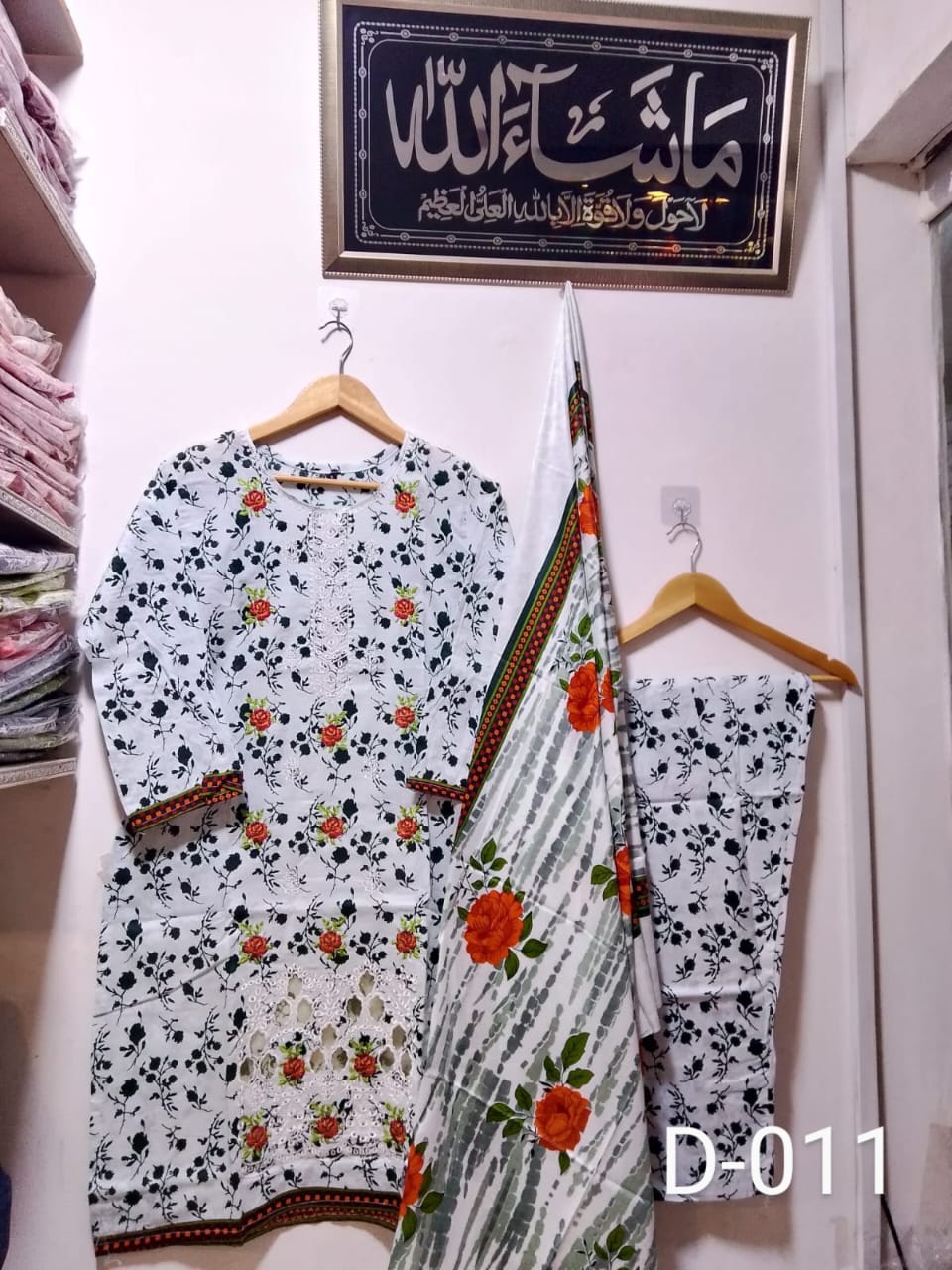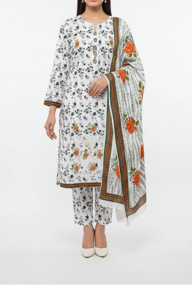 Lawn 3 piece Suiting Embroidered Shirt, Printed Trouzer,( 2.5 Meter Dupatta)