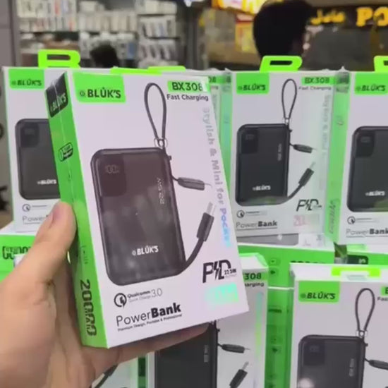 The power bank has 20,000 mAh (milliampere-hour) battery capacity that can charge devices twice in a row.