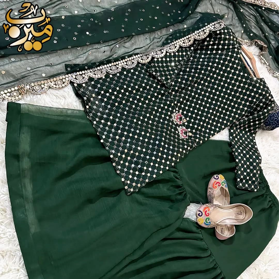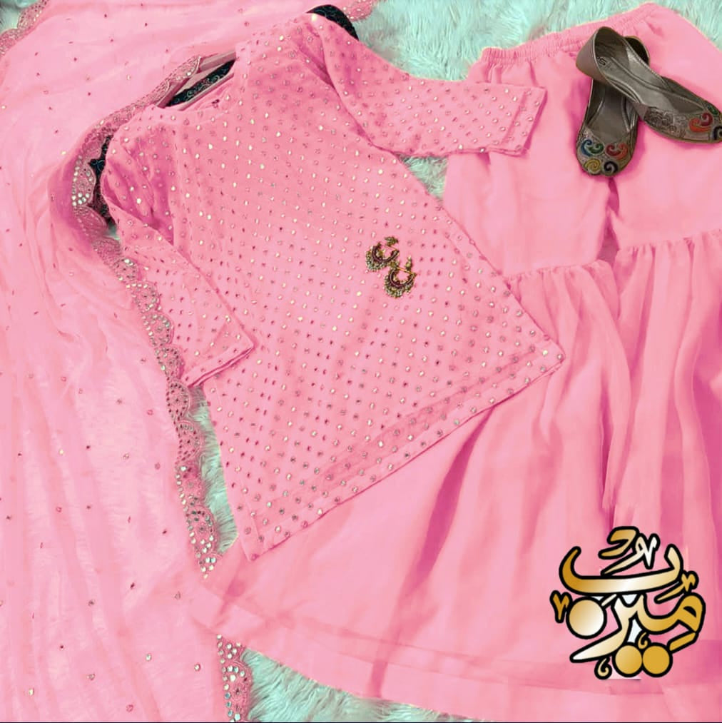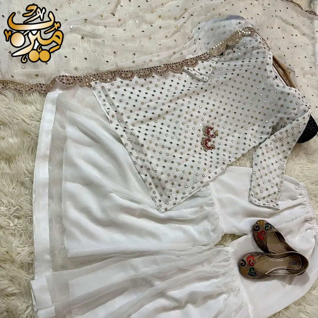 Front and Sleeves 9MM Sequence Embroidered Shirt, And Cut Work 9MM Dupatta with Garara 3Piece