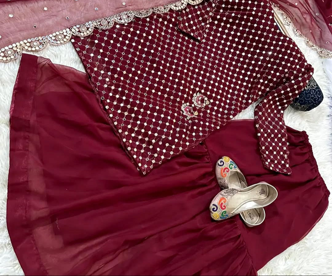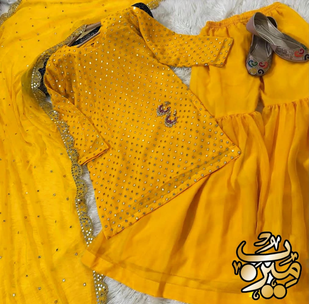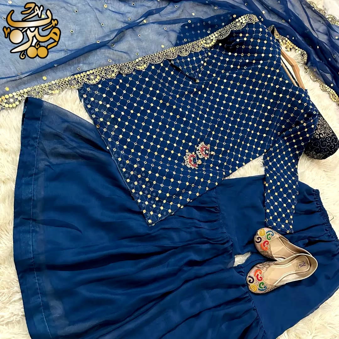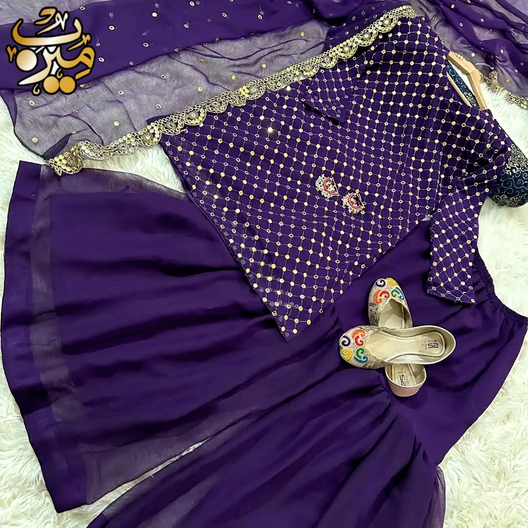 Front and Sleeves 9MM Sequence Embroidered Shirt, And Cut Work 9MM Dupatta with Garara 3Piece